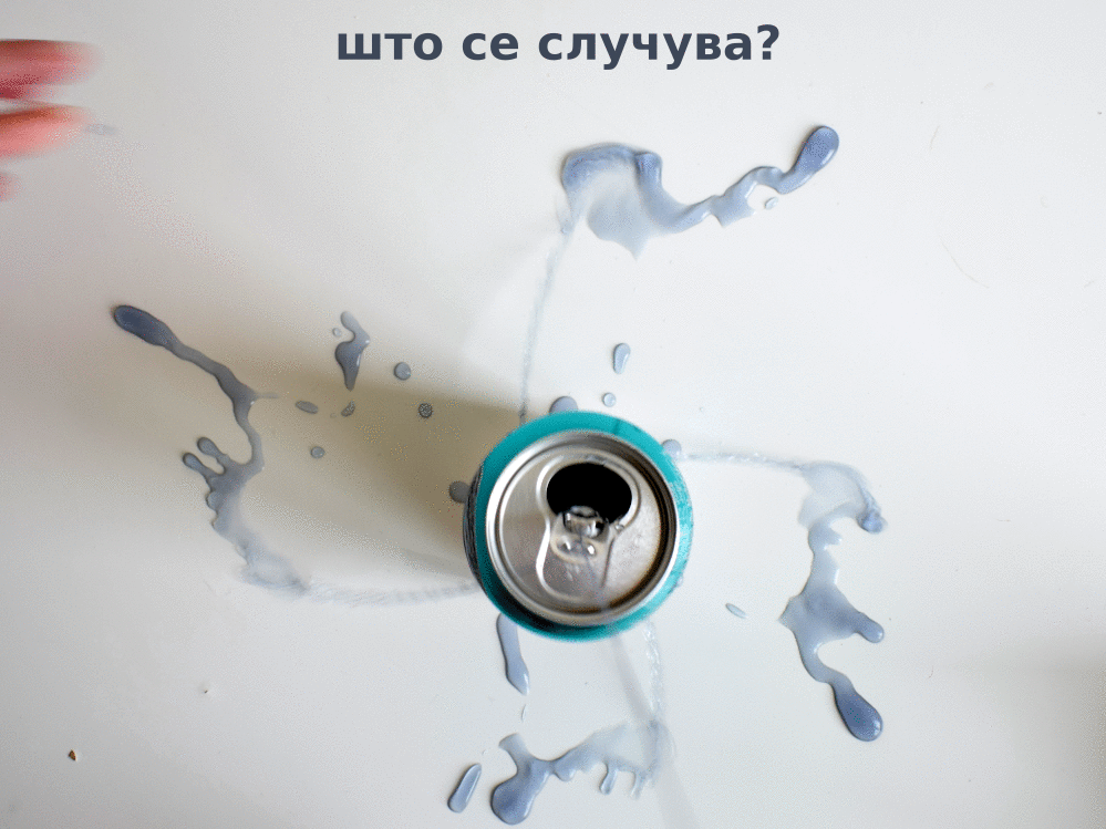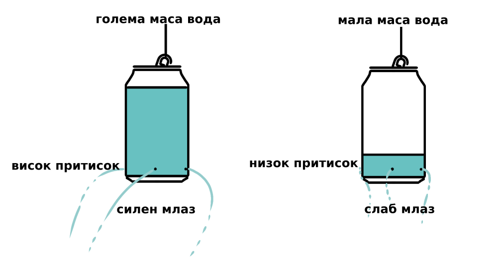 Ако набљудуваш внимателно, ќе забележиш дека на почетокот млазот вода е силен и паѓа далеку од лименката, но станува сѐ послаб и тече сѐ поблизу до лименката. Зошто се случува ова?