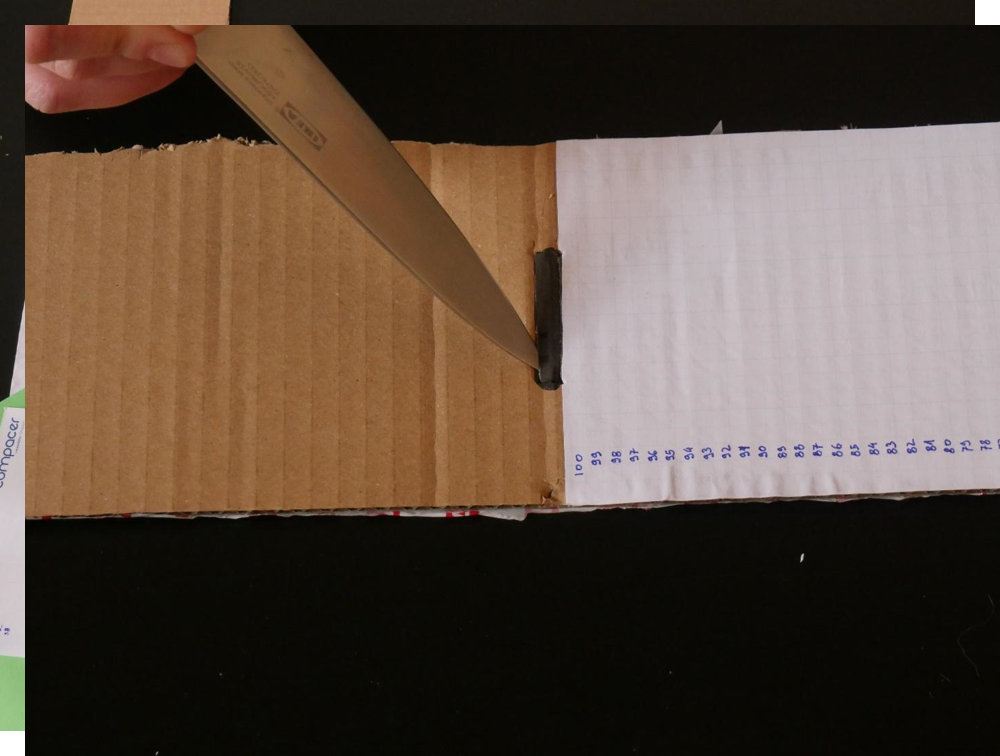 - На долниот дел од картонот залепи ја почвата со одбележани нивоа на вода. Најгоре треба да биде 100 а на дното 0. На средината на картонот, одма над нивото 100 на почвата, направи долг и тесен отвор. Отворот треба да е доволно голем за да може да се протне коренот без да се изгужва. Веднаш над отворот залепи го стеблото на растението. Протни го коренот на растението низ отворот и стави го ластикот или спојката точно на ниво на цртата 100.