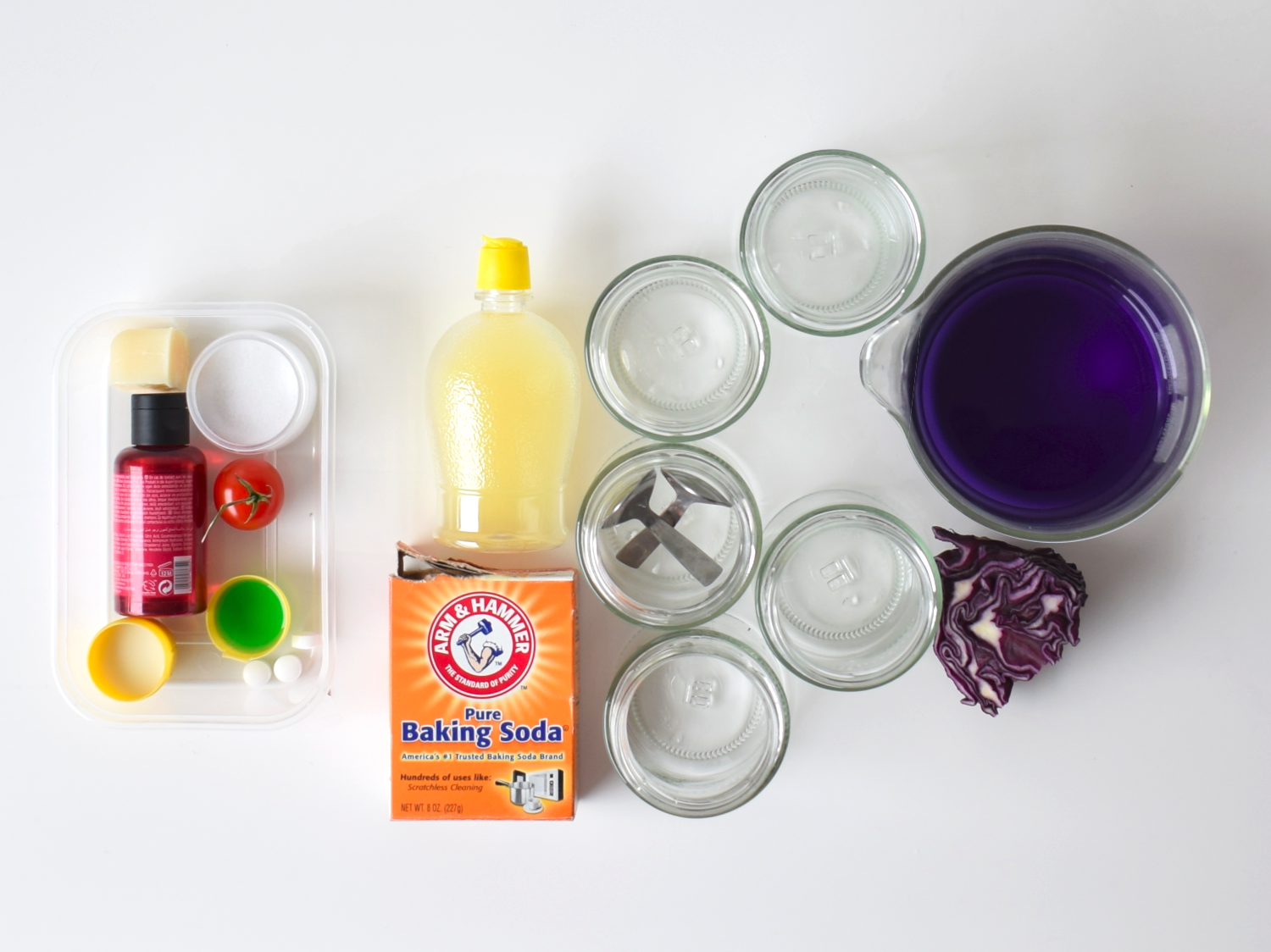 Стави малку сок од зелка во пет садови. Во два од садовите додај сода бикарбона: врв од мало лажиче во едниот, цело лажиче во другиот. Во други два садови додај сок од лимон: три капки во едниот, две лажички во другиот.