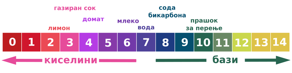 Кога раствораме некоја супстанца во вода, растворот може да биде кисел, базен или неутрален, и исто така може да биде повеќе или помалку кисел или базен. Ова се мери со pH вредноста. pH може да има вредности од 0 до 14. pH=7 значи дека растворот е неутрален. Тоа е pH вредноста на водата. Ако pH вредноста е помала од 7, растворот е кисел, и колку е помала толку е растворот покисел. Ако pH вредноста е поголема од 7 тогаш растворот е базен, и колку е поголема вредноста на pH толку е растворот посилна база.